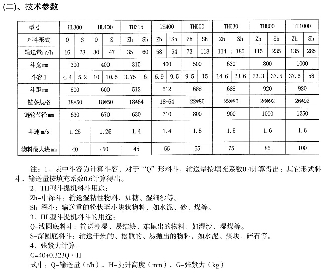 ④TH型斗式提升機技術(shù)性能見技術(shù)參數(shù)。
